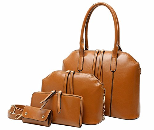 - Coordinating four-piece handbag set featuring footed domed satchel with removable cross-body strap, handbag with removable chain strap, double-zip wallet, and key case