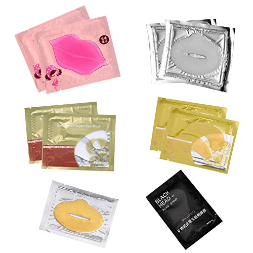 - Package includes: 2pc golden eye mask+ 2pc Collagen eye mask+ 2pc Collagen lip mask + 2pc Pink lip mask+ 1pc crystal lip mask + 1pc nose blackhead remove mask