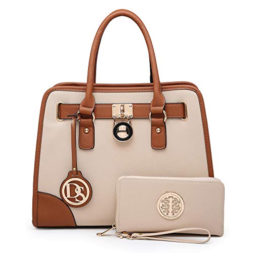- Design: This Dasein signature collection satchel handbag is very fashionable and sturdy. The two-tone block color appearance + gold tone metallic padlock + removable belt + fashion dasein logo tassel + leather chain shoulder strap. All of these fashion elements focus on our man-made high quality satchel. You can't go wrong with it.