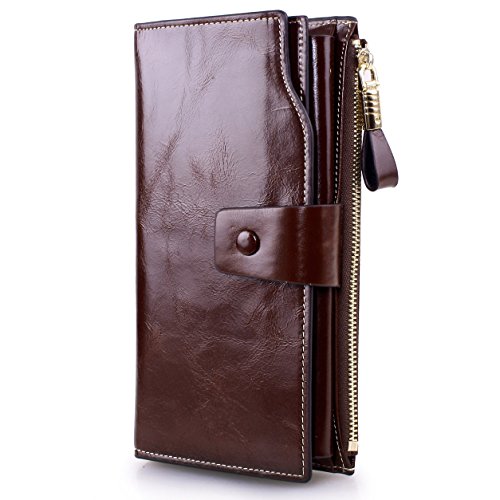 - Made of high quality cowhide leather, the oil wax leather makes the purse more luxury. Shiny gold-color hardware,heavy duty zipper and detailed contrast stitching brightens up the wallet.