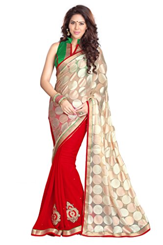 - Description: Beige and Red Brasso and Faux Georgette Half Half Party Wear Saree