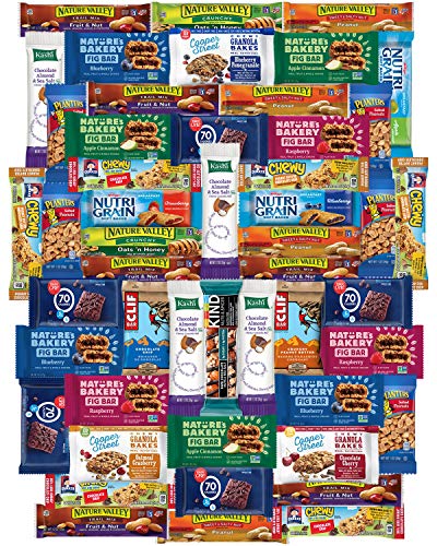 - Bundle Includes: 9 Natures Fig Bar - 2 oz, 8 Fiber One Bar - 1.4 oz, 4 Kashi Chocolate Almond & Sea Salt - 1.2 oz, 8 Quaker Chewy Bar - 0.84 oz, 8 Nature Valley Trail Mix - 1.2 oz, 8 Nature Valley Sweet & Salty - 1.2 oz, & 5 Planters Peanuts - 1 oz